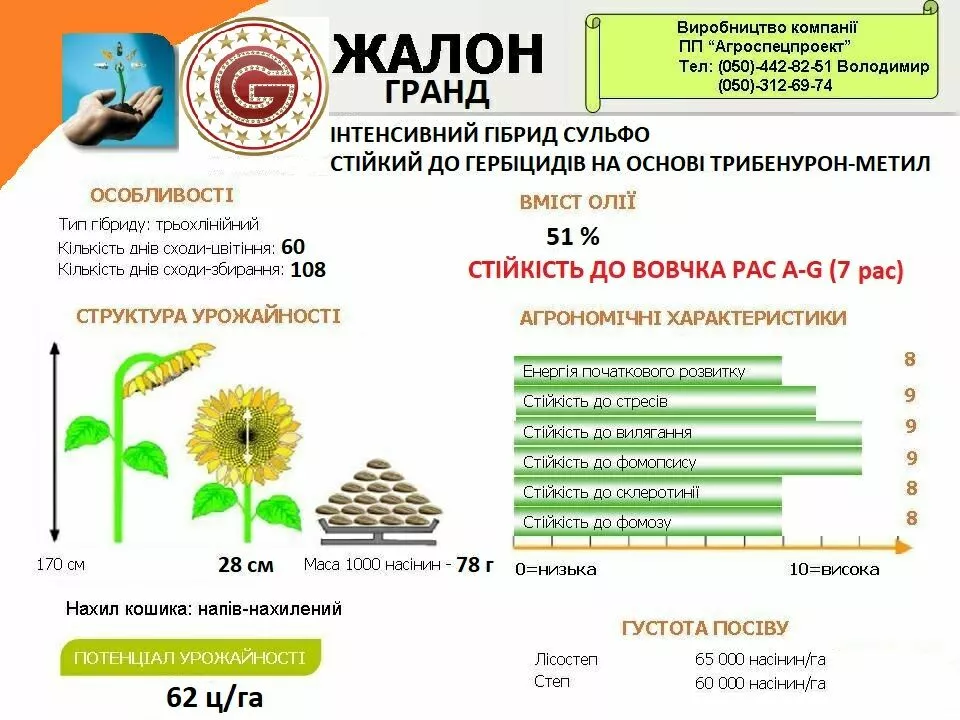 ЖАЛОН Гранд - трехлинейный гибрид. Группа спелости: средне-ранний гибрид. Период вегетации (108 дней).